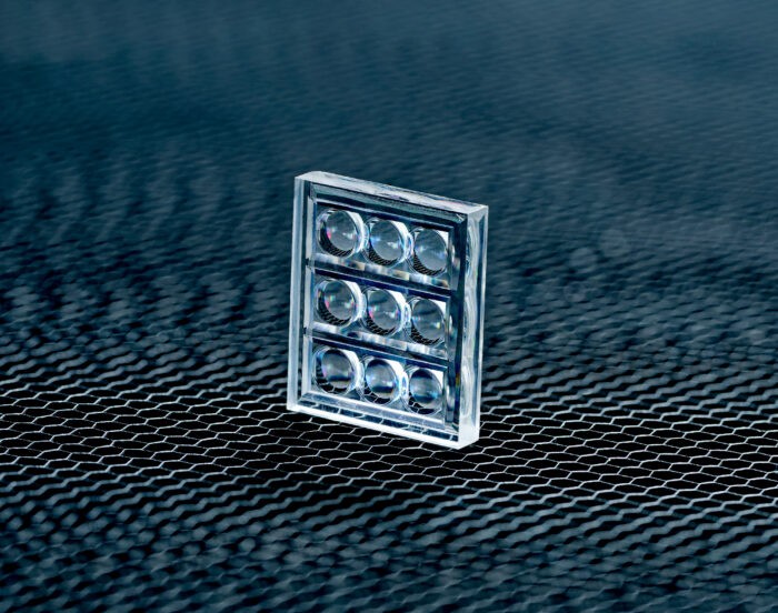 Das neu entwickelte Mikrolinsen-Array von INGENERIC umfasst 3 x 3 Linsen pro Array bei einer Gesamtgröße von 13,0 x 11,0 x 2,07 mm. Die komplexe asphärische Meniskus-Geometrie kombiniert konvexe und konkave Flächen. Dank variierender Radien ist jede Linse für spezifische Wellenlängen optimiert, was zu außergewöhnlich hoher Lichtausbeute und exzellenter Bildqualität führt. Ein spezielles Antireflexions-Coating (AR) reduziert Reflexionen auf unter 1 % des einfallenden Lichts, was die Effizienz der Bildgebung zusätzlich steigert.