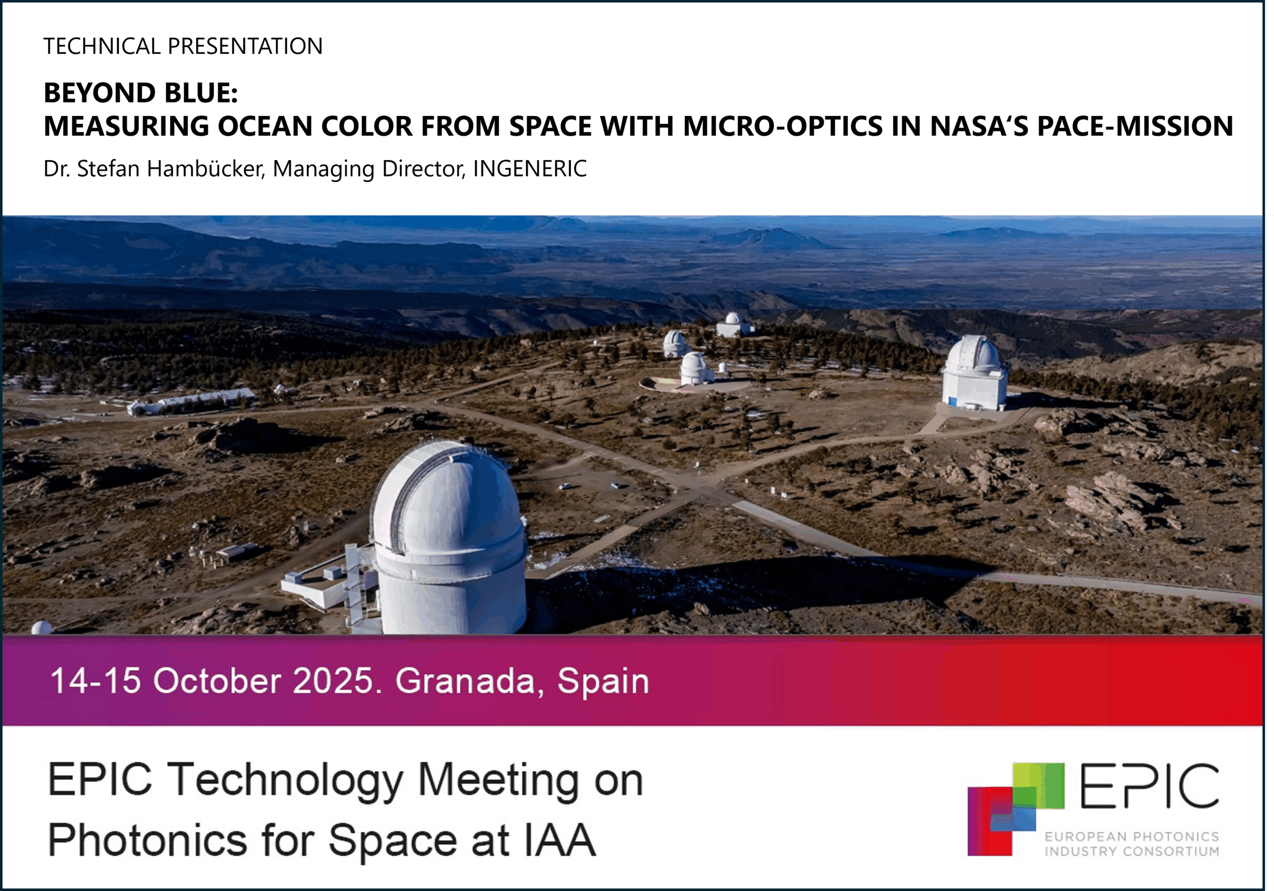 We are pleased to announce that Stefan Dr. Hambücker, Managing Director of INGENERIC, will be giving a technical presentation at the event: “𝗕𝗲𝘆𝗼𝗻𝗱 𝗕𝗹𝘂𝗲: 𝗠𝗲𝗮𝘀𝘂𝗿𝗶𝗻𝗴 𝗢𝗰𝗲𝗮𝗻 𝗖𝗼𝗹𝗼𝗿 𝗳𝗿𝗼𝗺 𝗦𝗽𝗮𝗰𝗲 𝘄𝗶𝘁𝗵 𝗠𝗶𝗰𝗿𝗼-𝗢𝗽𝘁𝗶𝗰𝘀 𝗶𝗻 𝗡𝗔𝗦𝗔’𝘀 𝗣𝗔𝗖𝗘-𝗠𝗶𝘀𝘀𝗶𝗼𝗻”